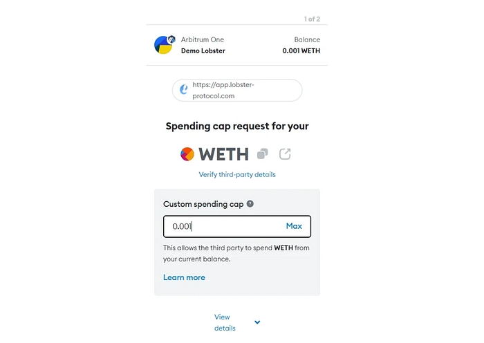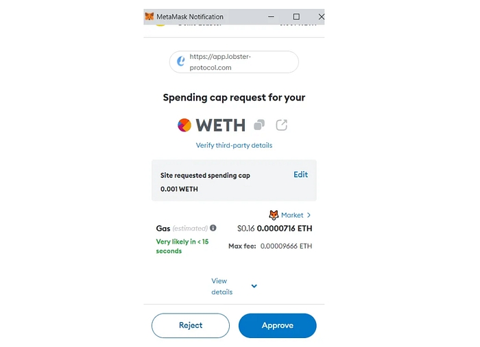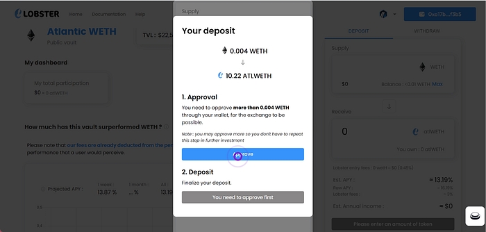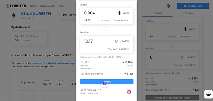 You have your WETH in your wallet, now it's time to deposit on Lobster Protocol!
