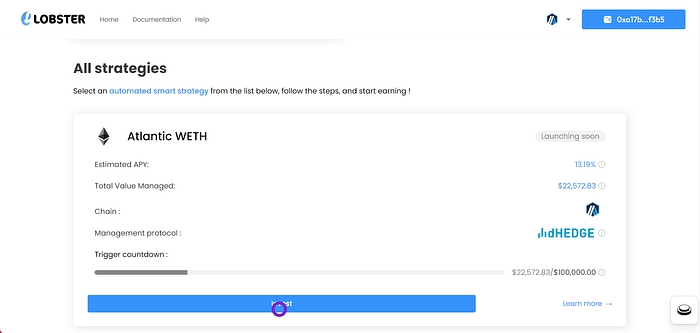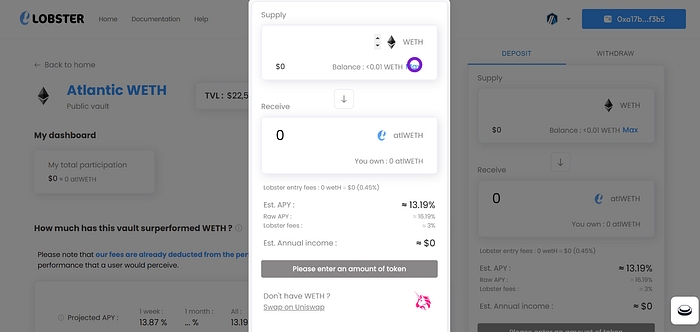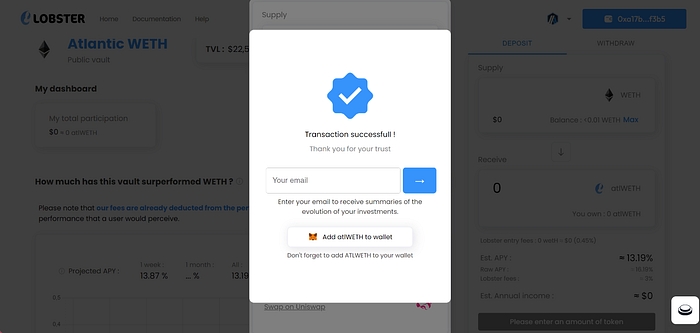 10. There you go! You have deposited on Lobster! Don’t forget to add atlWETH in your wallet by clicking on the button “Add atlWETH to wallet”!