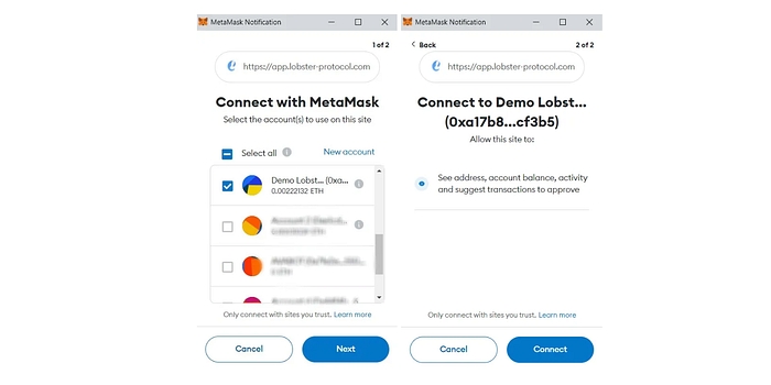 4. Connect your wallet to Lobster Protocol in the Pop-up of your wallet.